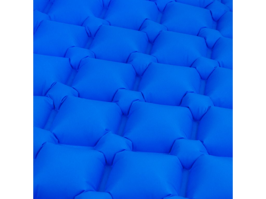 Dmuchany materac zachwyca już na pierwszy rzut oka swoim designem. Jego dominującą cechą są komory powietrzne, dzięki którym materac idealnie dopasowuje się do ciała. Komórki ograniczają również ruch powietrza, co znacząco wpływa na komfort spania.