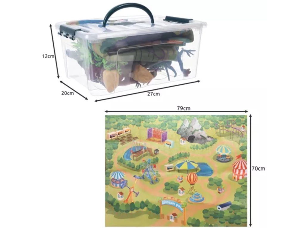 Ekskluzywny zestaw dinozaurów posiada także matę wykonaną z przyjemnej w dotyku tkaniny. Dzięki rozmiarowi 70 x 79 cm każde dziecko będzie zachwycone. Oprócz zabawy z dinozaurami, można ją również wykorzystać do innych zabaw.