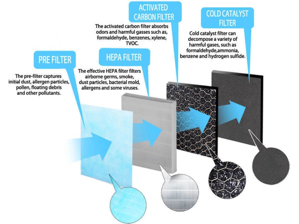 - Filtr 4-stopniowy: filtr wstępny, filtr z węglem aktywnym, filtr HEPA H11 i filtr katalityczny na zimno.