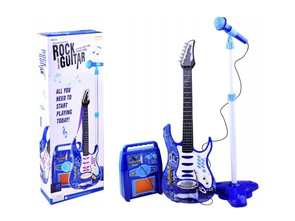 Dla jeszcze lepszych wrażeń muzycznych, zestaw zawiera również wzmacniacz i mikrofon ze statywem. Wzmacniacz i gitara są zasilany trzema bateriami AA (brak w zestawie), a mikrofon i gitarę podłącza się do wzmacniacza za pomocą kabli (w zestawie). Regulowana wysokość stojaka pozwala dopasować zestaw do wzrostu dziecka. Zabawka wspiera rozwój małej motoryki , słuch muzyczny i kreatywność dzieci.