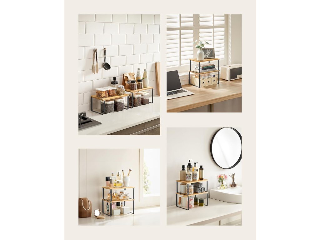 Dzięki dwóm różnym wysokościom (33,5 x 19,5 cm i 33,5 x 18,5 cm), ten zestaw bambusowych półek kuchennych pozwala na różnorodne możliwości aranżacji. Można je stosować jako rozwiązanie warstwowe, ustawiać obok siebie lub w różnych kątach pomieszczenia.