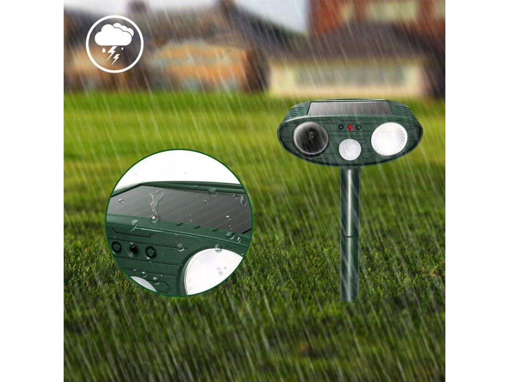 Urządzenie jest bezobsługowym urządzeniem bezprzewodowym, odpornym na zmiany warunków atmosferycznych oraz wodę. Wystarczy wbić go w ziemię w wybranym miejscu lub zawiesić na przykład na ścianie i włączyć, co automatycznie go aktywuje. Ładowany jest za pomocą panelu słonecznego umieszczonego na górze urządzenia. Zapewnia to całodobową ochronę Twojego ogrodu.