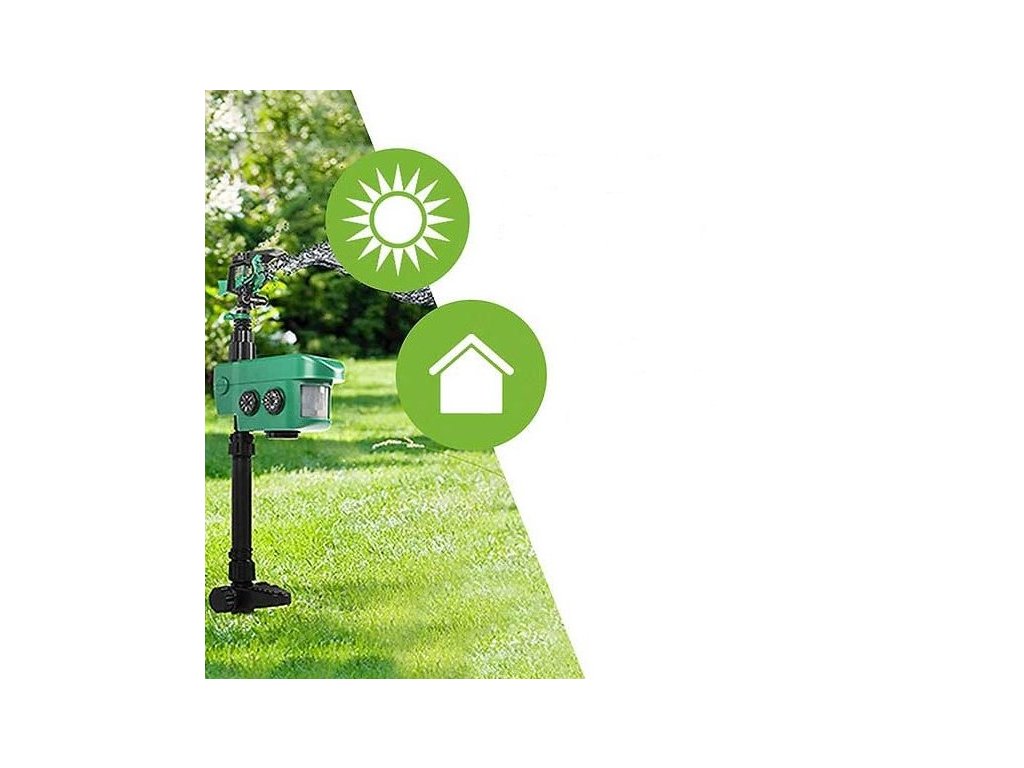 Urządzenie jest bezobsługowym urządzeniem bezprzewodowym, odpornym na zmiany warunków atmosferycznych i wody. Wystarczy wbić go w ziemię w wybranym miejscu, podłączyć wąż z wodą i włączyć. Wbudowany panel słoneczny ładuje baterię. Zapewnia to całodobową ochronę Twojej własności.