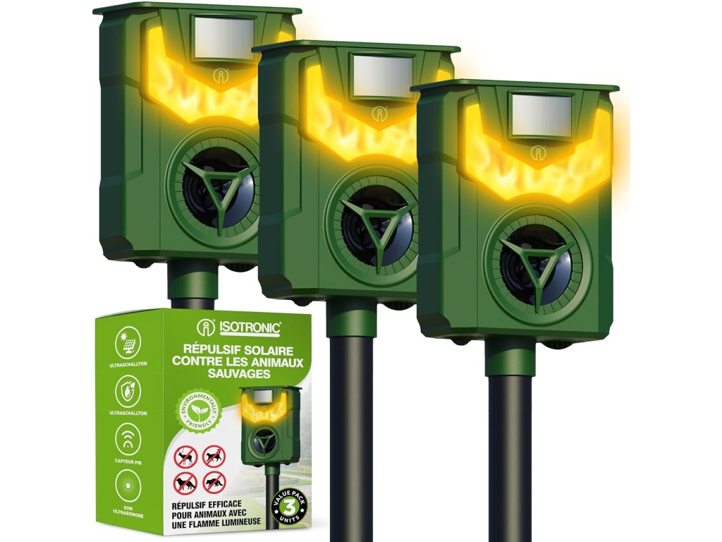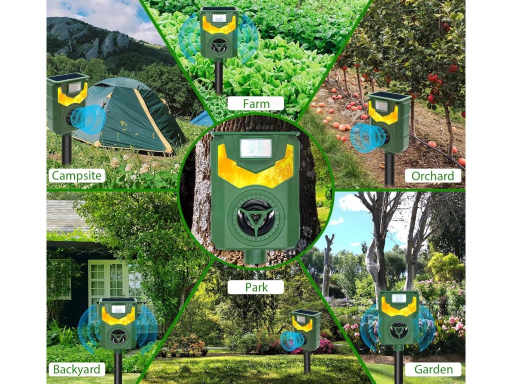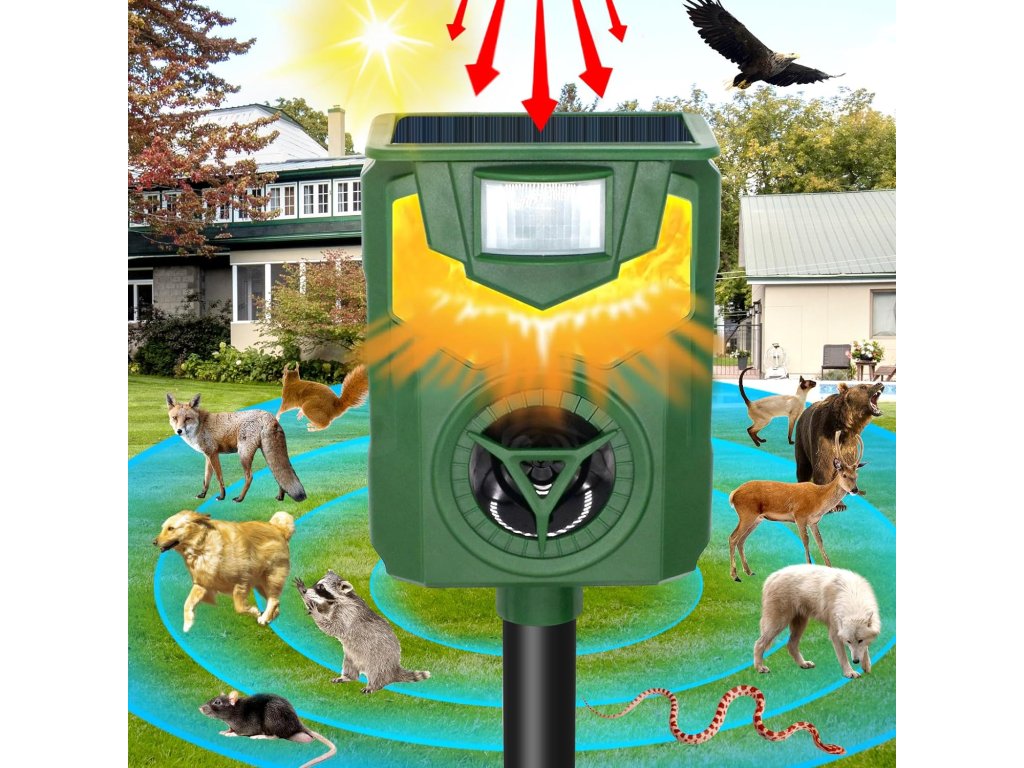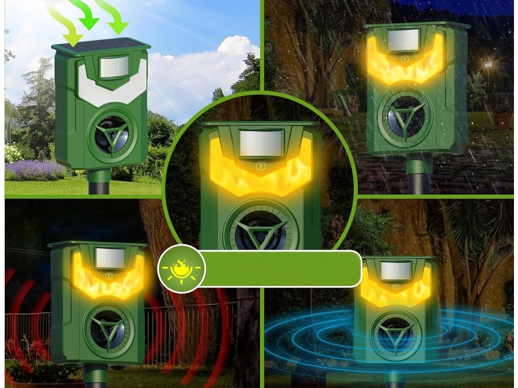 Poznaj wyjątkowy odstraszacz zwierząt, który posiada dwie funkcje. Straszy za pomocą fal ultradźwiękowych i efektu świetlnego przypominającego płomienie. Zwierzęta wolą unikać obszaru chronionego, niezależnie od tego, czy są to koty, psy czy inne zwierzęta.