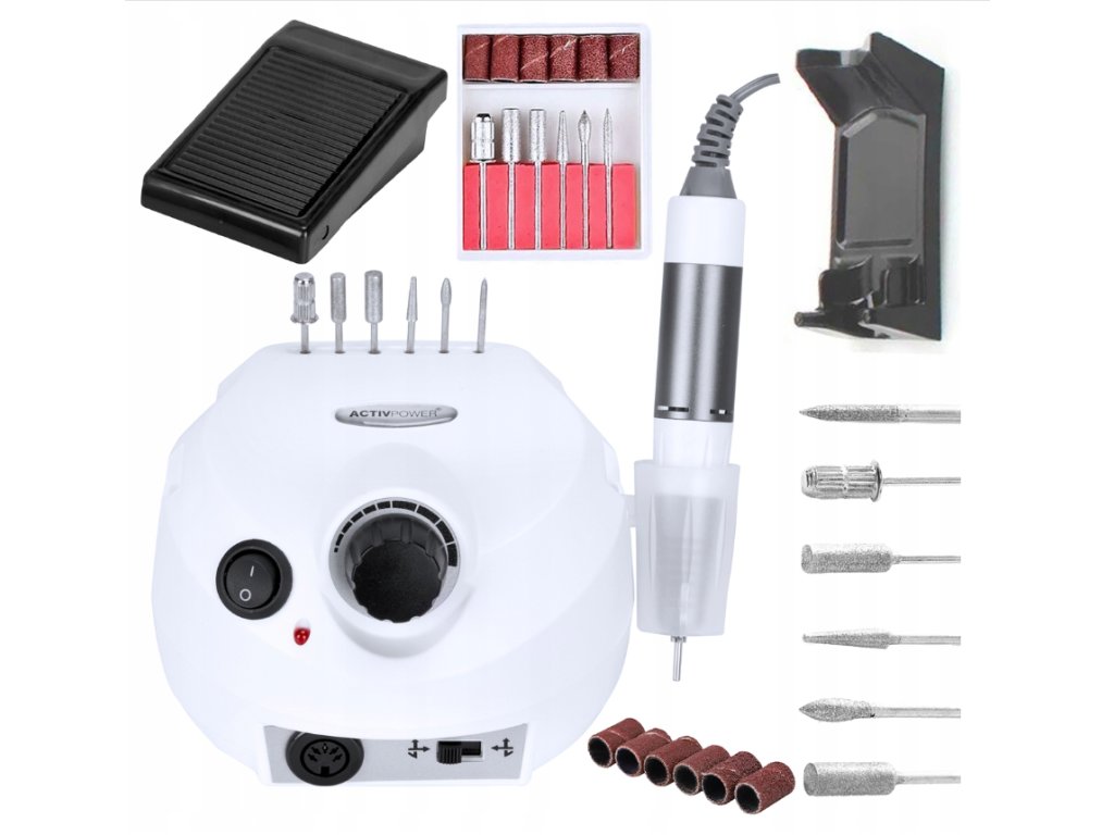 W zestawie ze szlifierką znajduje się również zestaw uniwersalnych diamentowych trzpieni szlifierskich oraz wałków szlifierskich. Wałki szlifierskie przeznaczone są do prac o większej precyzji, takich jak przygotowanie paznokci (zmatowienie) oraz usuwanie żelu i lakieru. Za pomocą innych frezarek można nadać paznokciom odpowiedni kształt, szlifować je, usuwać zrogowaciały naskórek itp.