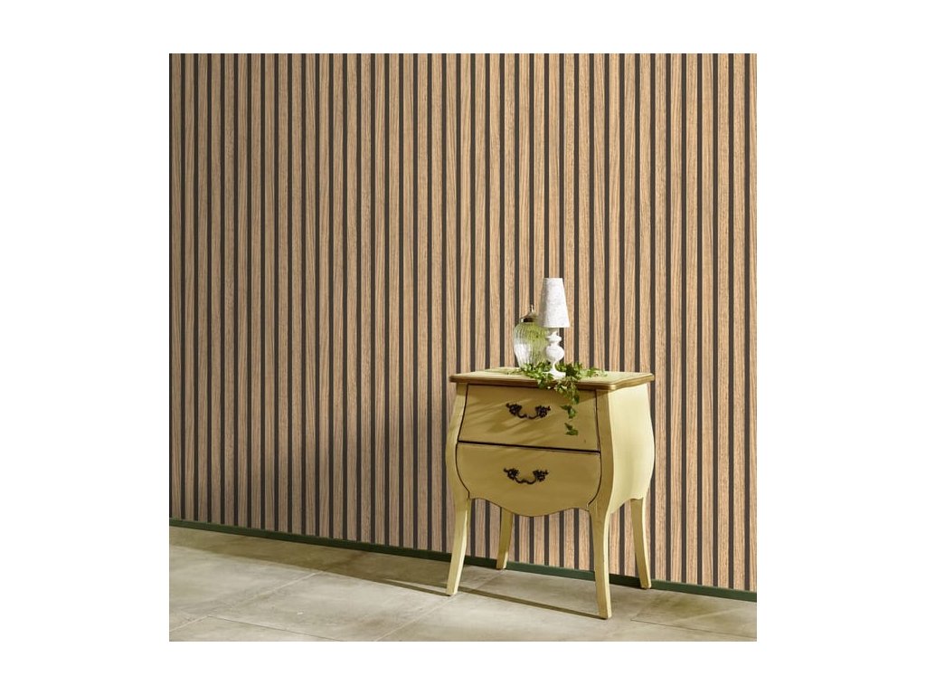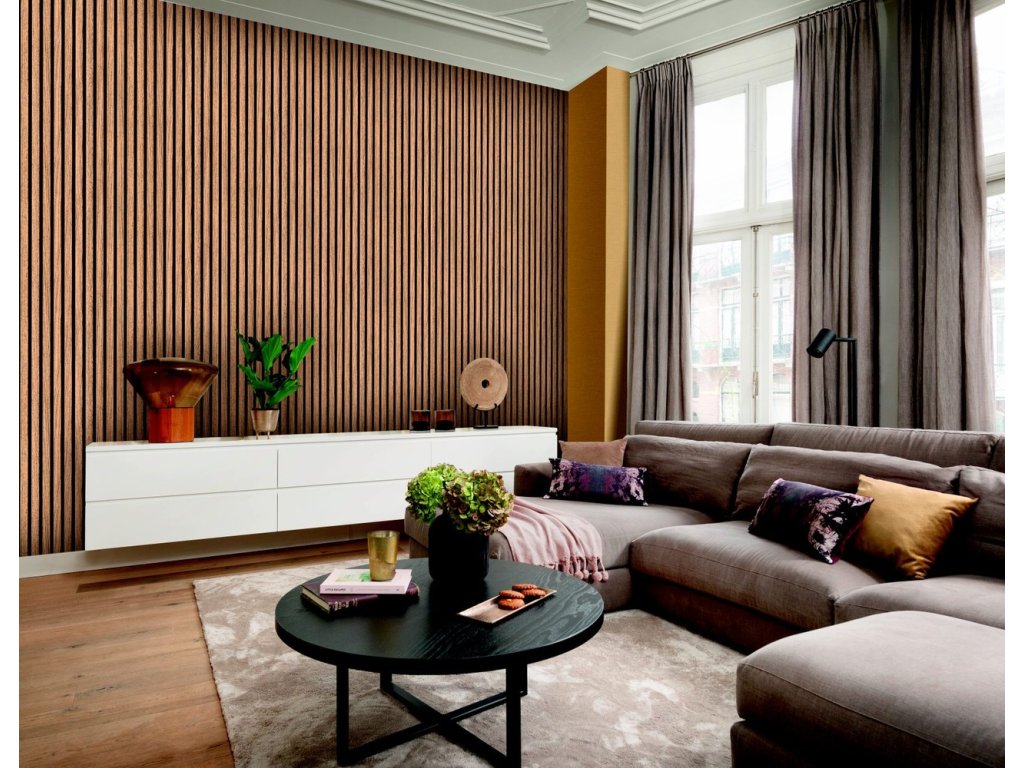 Samoprzylepna tapeta ścienna z listwami została zaprojektowana tak, aby jak najwierniej imitowała drewniane listwy. Wzór tworzy głębię i naturalny wygląd, który nada pomieszczeniu odpowiedni klimat, bez konieczności inwestowania w okładzinę z prawdziwego drewna.