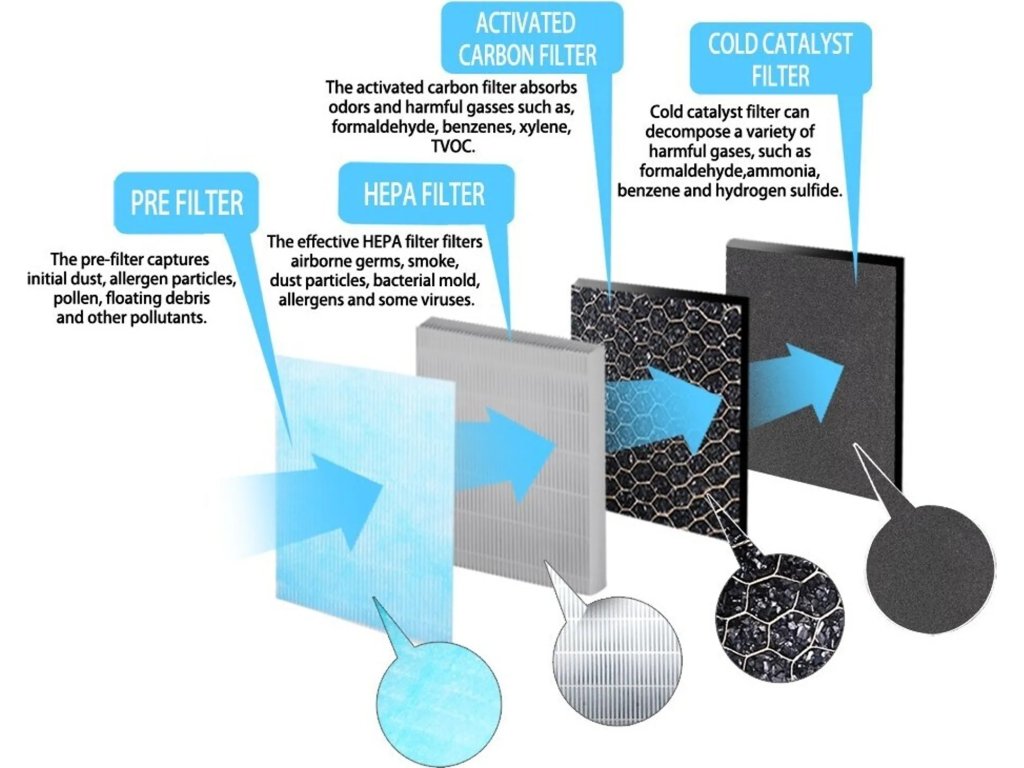 - Filtry: 4-stopniowy system filtracji (filtr wstępny + filtr z węglem aktywnym + filtr HEPA H11 + filtr katalityczny na zimno)