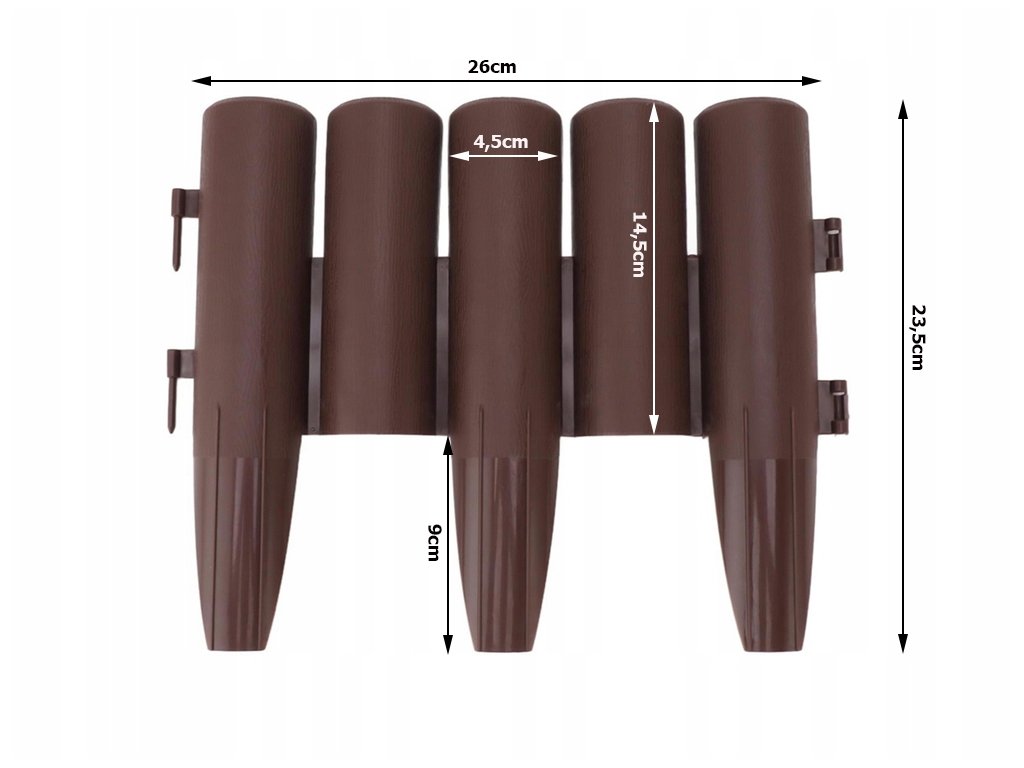 Długość jednej części wynosi 26 cm, natomiast w jednym opakowaniu otrzymujesz aż 2,15 m ozdobnego ogrodzenia. Poszczególne części można dowolnie łączyć w różne kształty - proste, okrągłe, faliste. Z palisady ogrodowej możesz stworzyć naprawdę spersonalizowane ogrodzenie dla swoich kwiatów.
