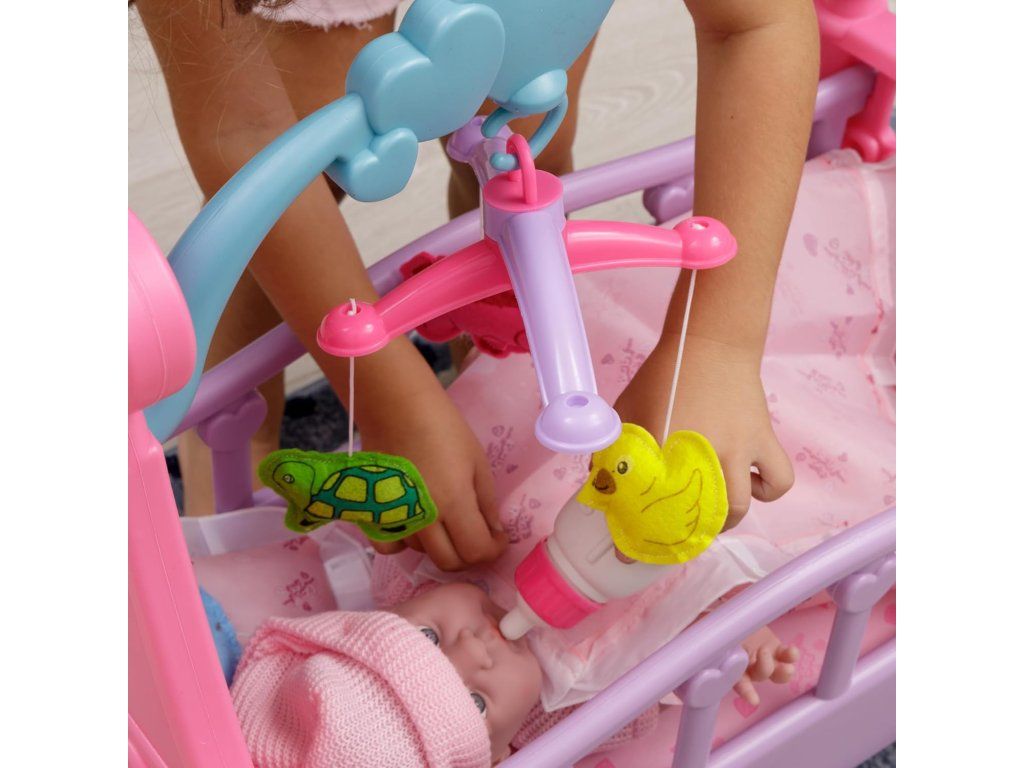 Idealne łóżeczko dla lalek zachwyci swoim uroczym designem i misternymi zdobieniami. Połączenie delikatnych odcieni różu i fioletu działa uspokajająco i będzie pasować do każdego otoczenia, w którym bawi się dziecko.