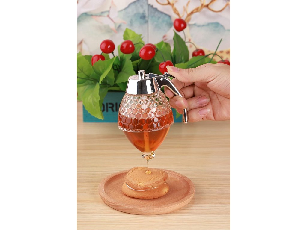 Pojemność dozownika wynosi 200 ml. Idealny rozmiar przy większej ilości gości. Nasz dozownik miodu jest wyposażony we własną podstawkę. Wystarczy go podnieść i od razu można z niego korzystać. Kiedy go nie potrzebujesz, odłóż go z powrotem na podstawkę. Jest niezwykle wygodny w użytkowaniu i nie robi bałaganu.