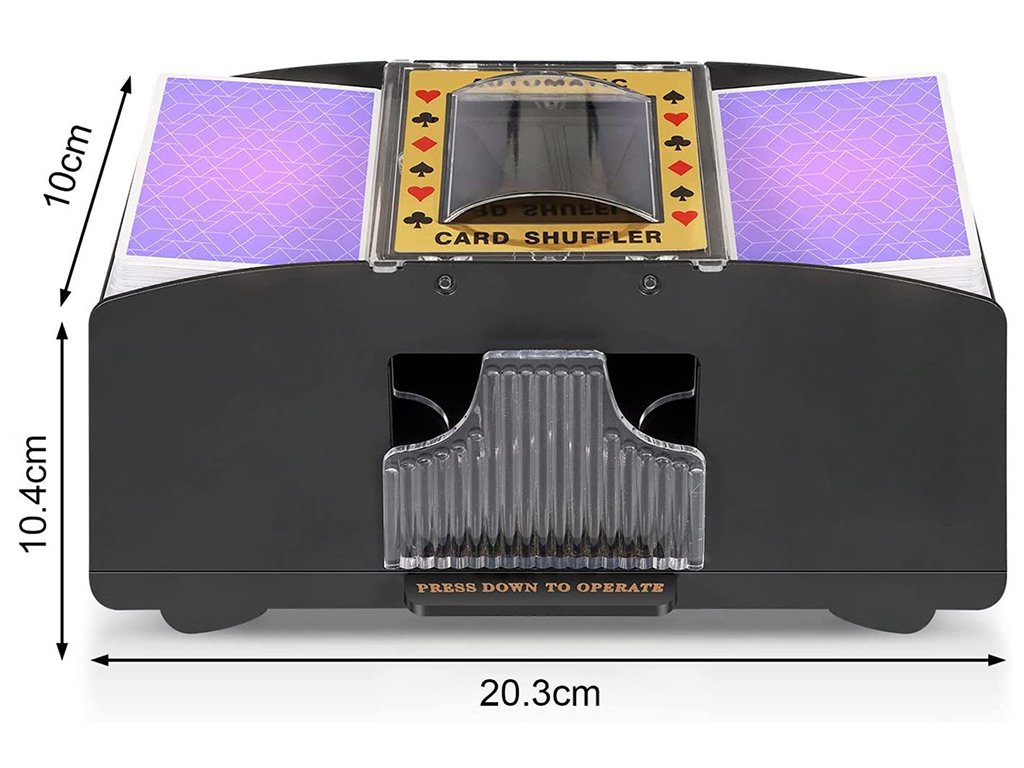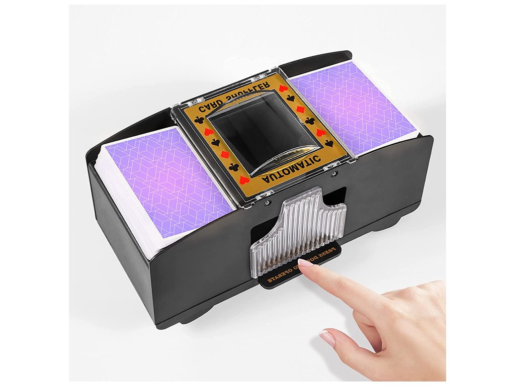 Automatyczna tasowarka kart posiada dwie przegródki, do których można włożyć aż dwie talie kart lub jedną talię podzieloną na dwie połowy. Dzięki temu możesz cieszyć się dowolną grą karcianą.