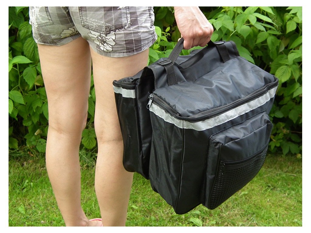 Nie masz gdzie położyć komórki, dokumentów, książki, okularów, zakupów czy ubrań? Przynosimy świetne rozwiązanie. Wyjątkowa podwójna torba rowerowa zapewni Ci dużo miejsca do przechowywania na Twoim rowerze. Oferuje dużo miejsca na najpotrzebniejsze rzeczy. Składa się z dwóch kieszeni głównych i bocznych. Zapewnia to bardzo dużo miejsca do przechowywania. Dzięki praktycznemu uchwytowi jest łatwa do przenoszenia.